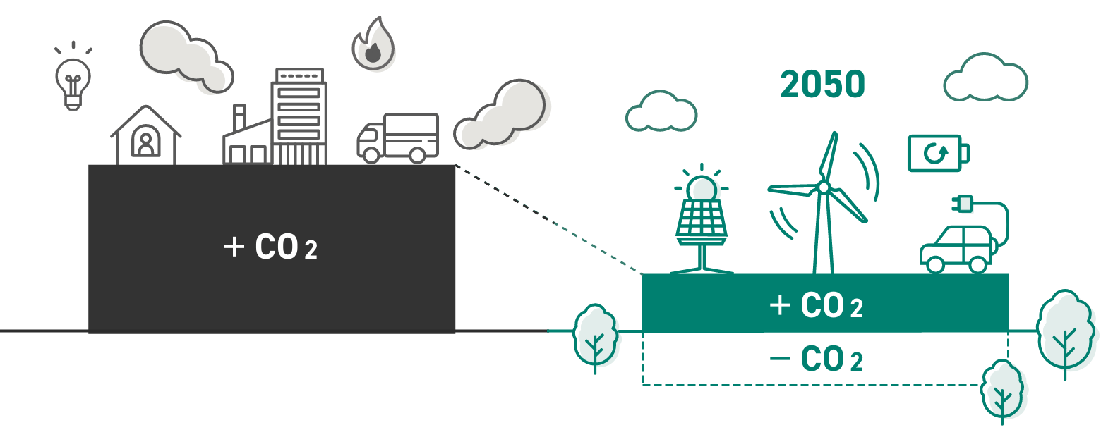 プラスマイナスゼロとは、二酸化炭素の排出量を減らしつつ、排出してしまった二酸化炭素を様々な方法で吸収・固定・除去して相殺し、実質的にゼロを目指すという意味です。